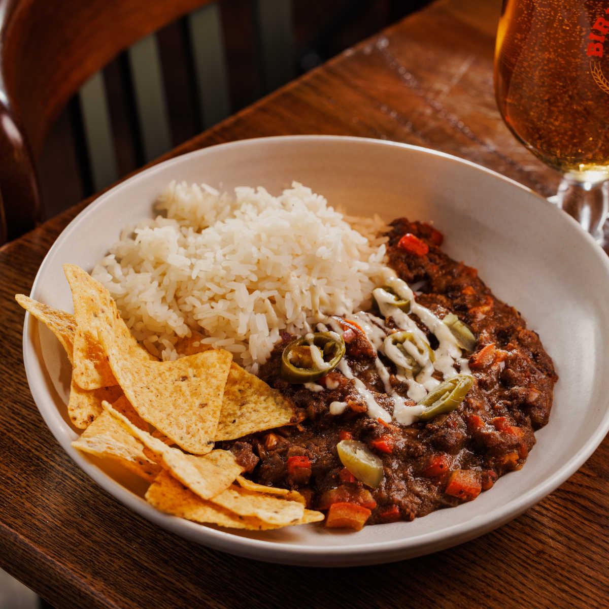 Chilli con carne, with long-grain rice, tortilla chips and jalapeños | 8.99 441 kcals