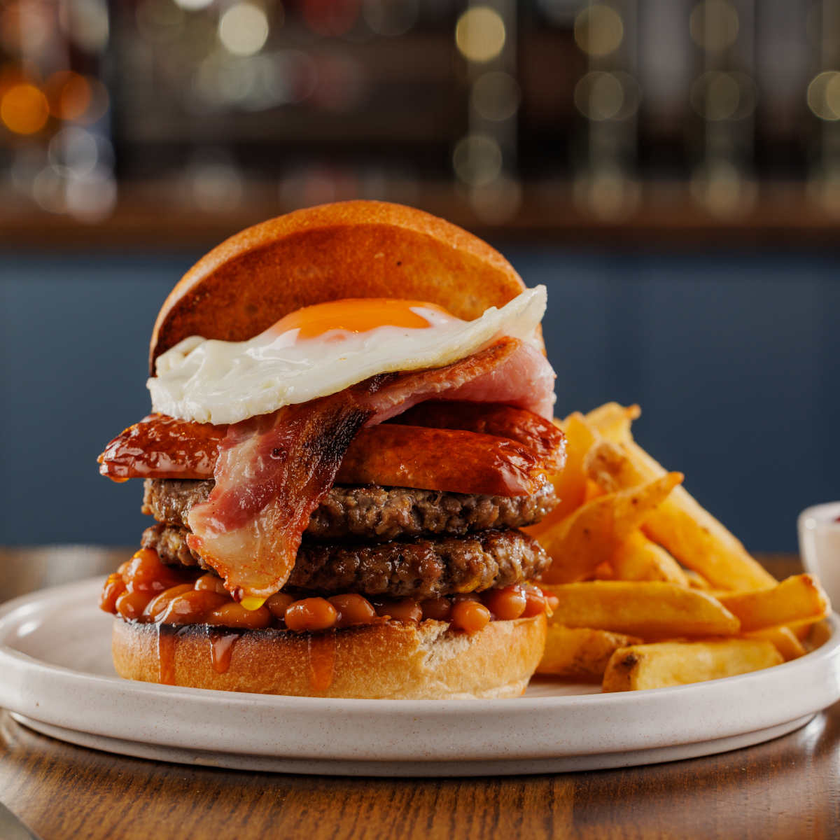 Traditional breakfast, pork sausages and bacon rashers served with a free-range fried egg, hash brown, mushrooms, tomato and baked beans | 9.99 1184 kcals