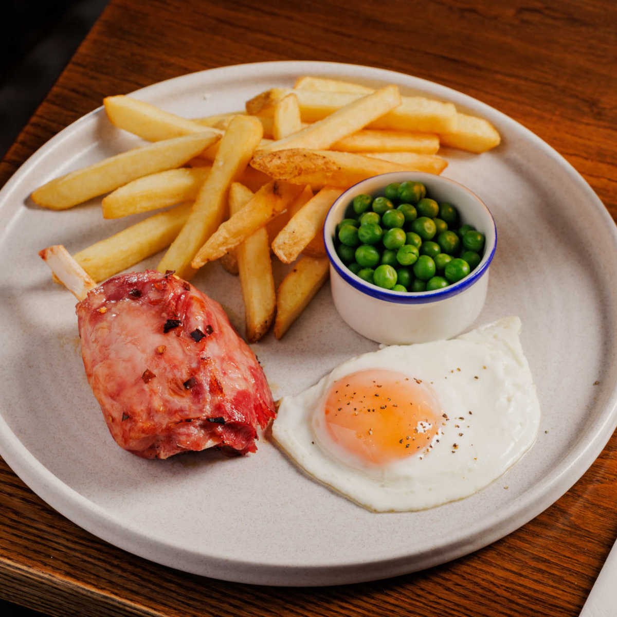Honey-glazed ham hock, with a free-range fried egg, chips and garden peas | 15.99 1217 kcals